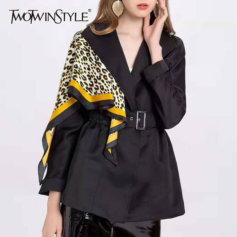 incredible TWOTWINSTYLE Patchwork Leopard Women's Coats Lapel Collar Long Sleeve High Waist With Sashes Female